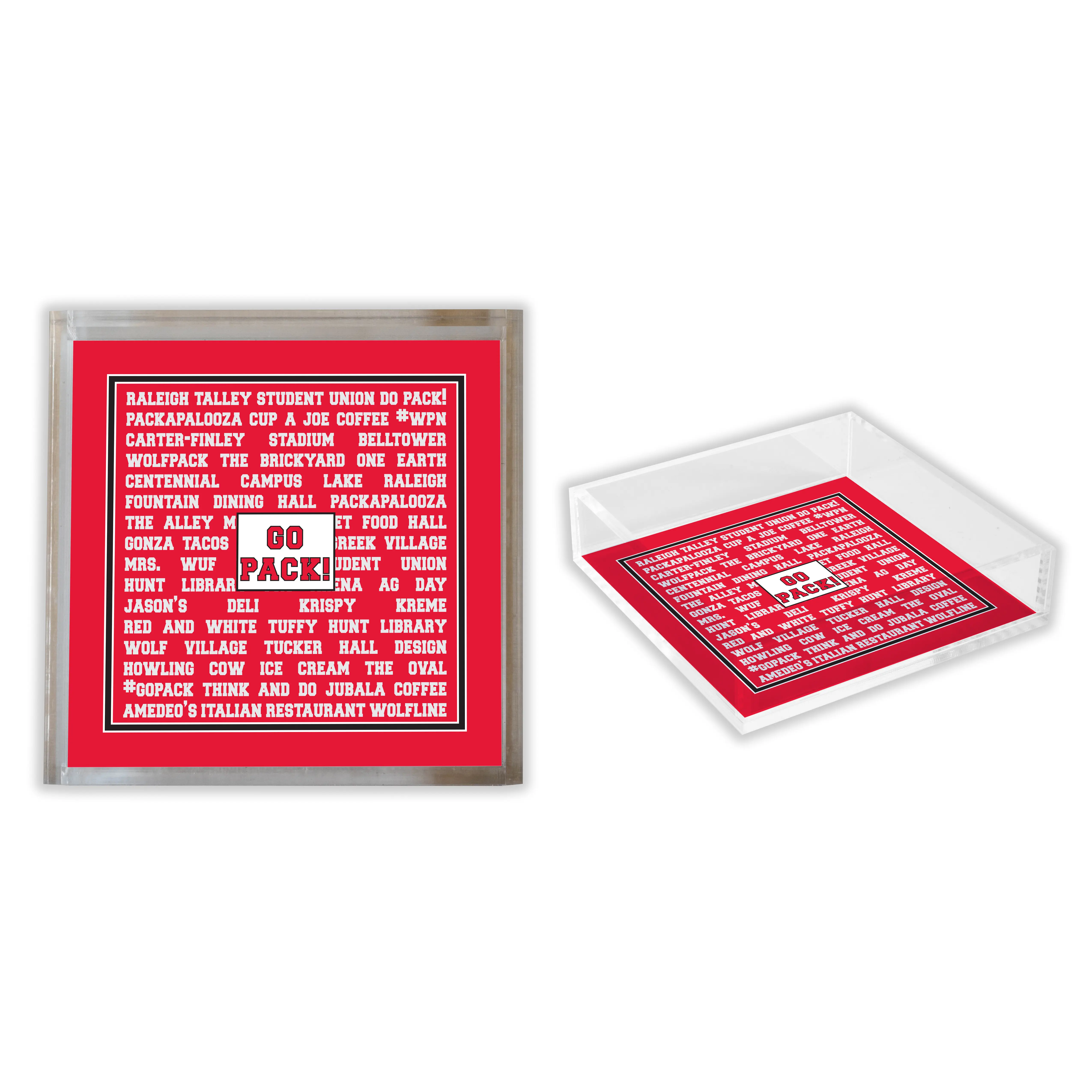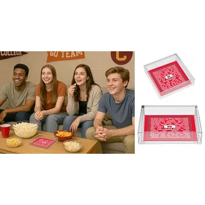 This stylish square acrylic tray beautifully captures the spirit of campus life at a beloved college. Crafted from premium, crystal-clear acrylic, it features a bold design filled with iconic words and phrases that evoke pride, nostalgia, and school spirit—everything from favorite hangouts and traditions to rally cries and memorable landmarks. At the center, the college slogan stands out proudly, surrounded by a collage of familiar campus references that bring back memories of game days, study sessions, and late-night pizza runs. Both functional and decorative, this tray is perfect for serving snacks at tailgates or displaying on a coffee table as a conversation piece. Its durable, glossy finish makes it easy to clean while maintaining its vibrant, collegiate design. A thoughtful gift for students, alumni, or fans, this acrylic tray is a timeless celebration of community, friendship, and school pride.